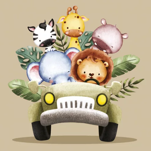 - Dizájn: vidám szafari jelenet állatokkal és dzsippel
