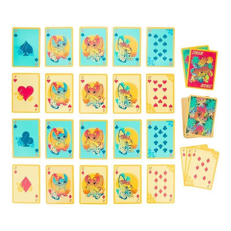 Aranyos karaktertervezéssel a Bubi, Királynő és Király kártyák Scrumpot, Angyalt és Stitchet ábrázolják, míg Lilo és Stitch a joker kártyákon a középpontban jelennek meg, hogy egy kis szórakozást nyújtsanak. Minden kártya vízálló, könnyen letörölhető, így tartós szórakozást biztosít.