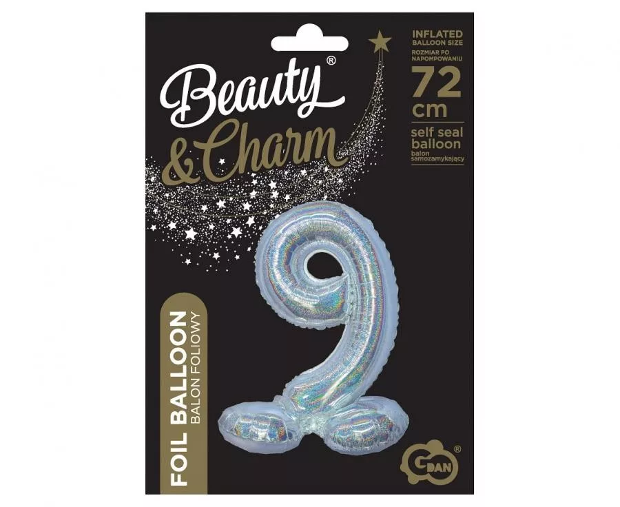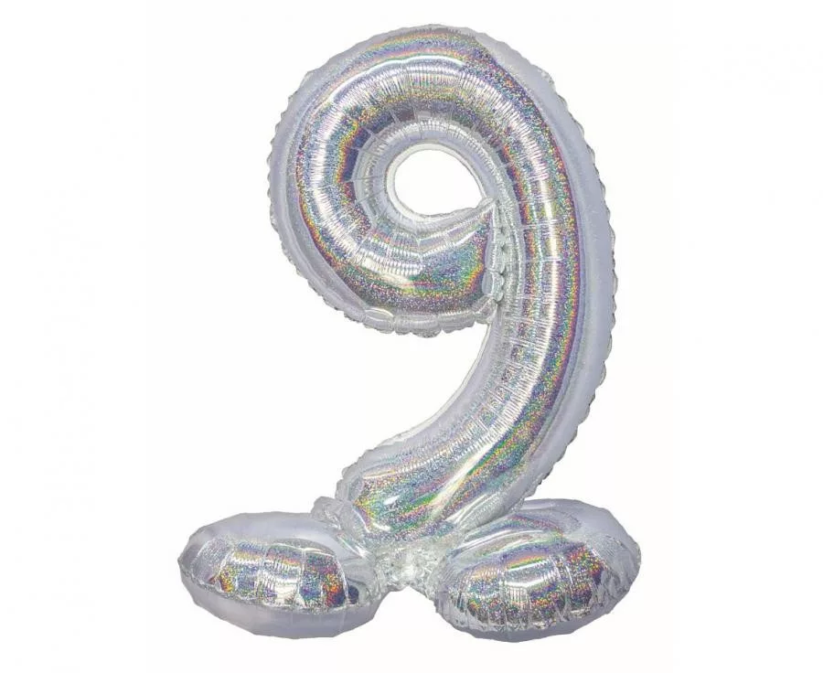 Holographic Silver, Ezüst 9-es szám fólia lufi talppal 72 cm