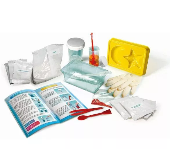 - gipsz, öntőforma, kesztyű, színezék, műanyag tál