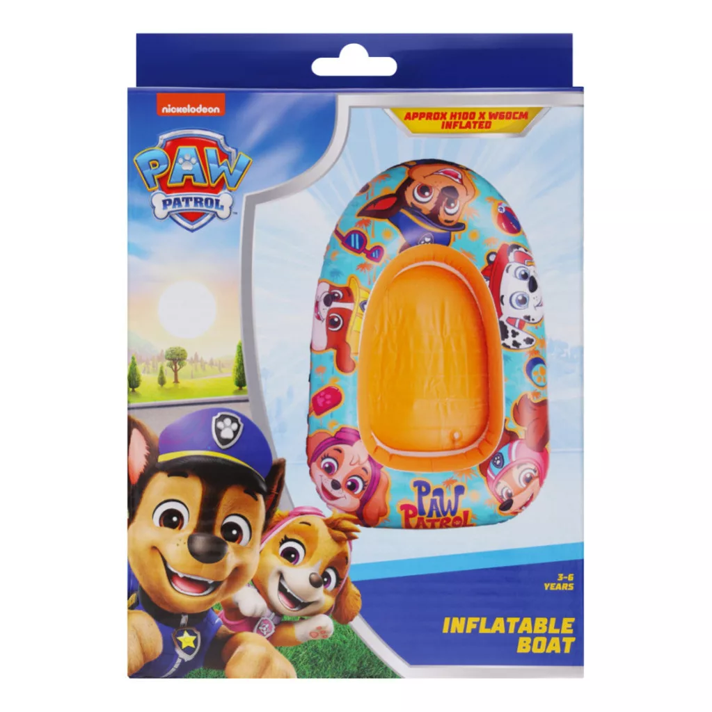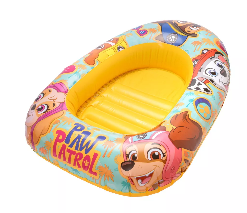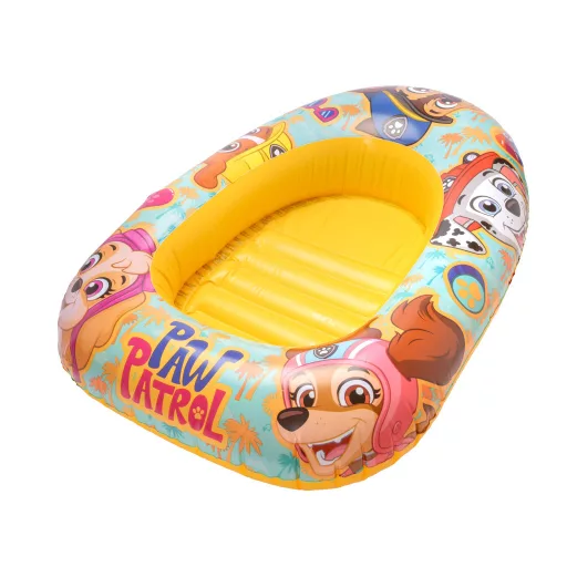 Ez egy Mancs Őrjárat mintás felfújható gumicsónak, amely gyerekek vízi játékára szolgál sekély vízben, például medencében vagy strandon.