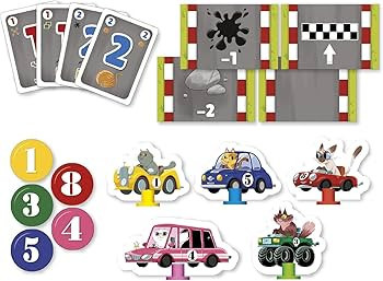 - 66 db kártya, 5 db zseton, 5 db játékosjelölő, 5 db rajtszám jelölő, 16 db útszakasz kártya