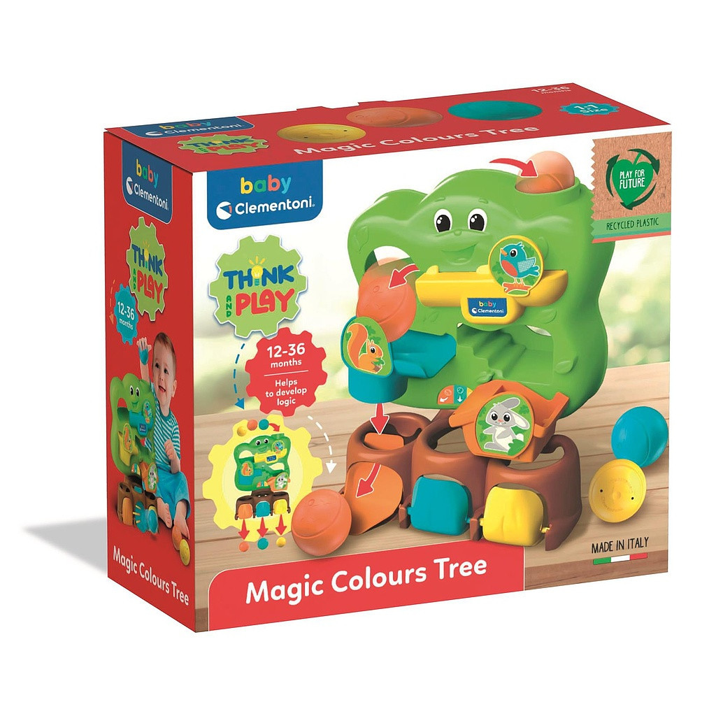 - A 3 különböző méretű, színes golyó lecsúszik a fa törzséig, és mintegy varázsütésre az azonos színű ajtó mögé kerül.