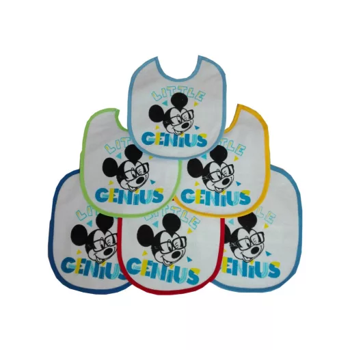 Disney Mickey 6 darabos baba pamut előke szett gumírozott nyakpánttal, különböző színekben.